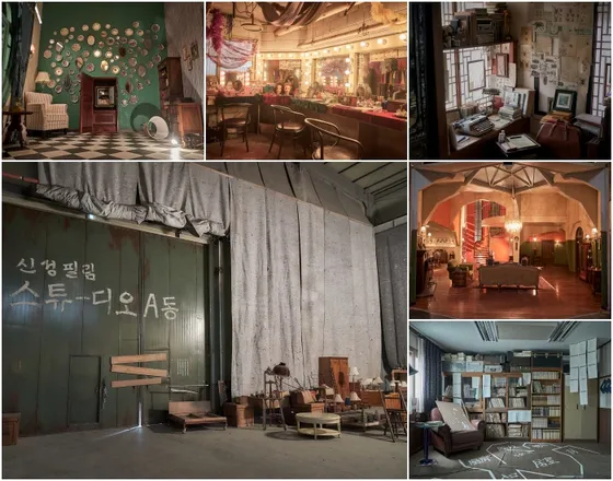 영화의 배경은 1970년대를 흑백사진으로 기록하고 있지만, 영화 속 주요 촬영 장소인 신성필림 스튜디오와 '거미집'의 세트장은 세련되고 화려한 색감으로 새롭게 재구성되어 있습니다. 이 스튜디오는 영화 속 영화 '거미집'의 촬영 세트장으로 사용되며, 검열을 피하기 위해 나무 판자로 막힌 공간 등이 영화의 설정과 시대 분위기를 반영하고 있습니다.